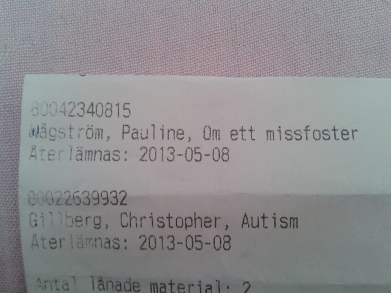 En trevlig överraskning … … väntade mig på biblioteket! Jag såg att min bok var inne (för en gångs skull), och i den så låg det ett kvitto. Det känns jättekul att se sitt namn där 😀 // Polly Posted: 25 augusti, 201311 augusti, 2023 by Pauline Wågström Category: Min dagbok, Mitt skrivande, Om ett missfoster Previous Post Next Post
