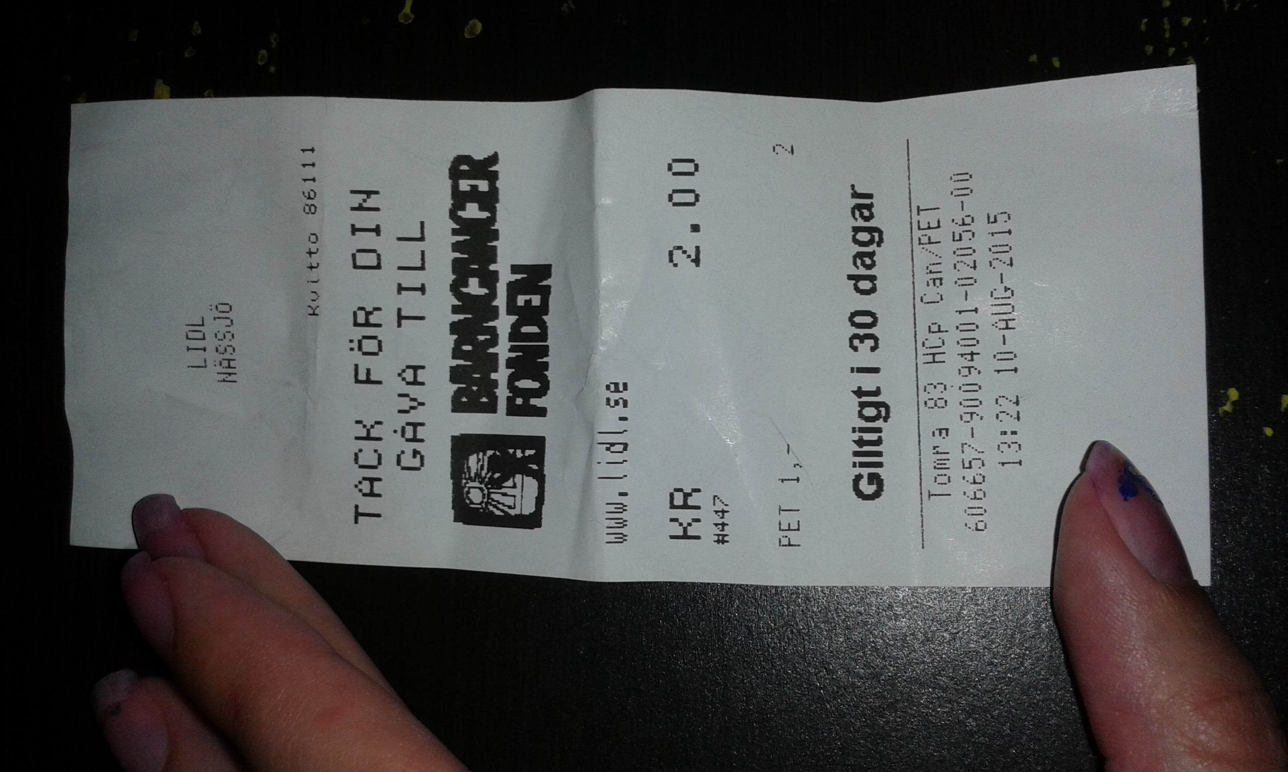 För några dagar sen hittade jag två pantburkar på Lidl och de har en pantautomat där man kan välja att skänka pengarna till Barncancerfonden. Bra initiativ!