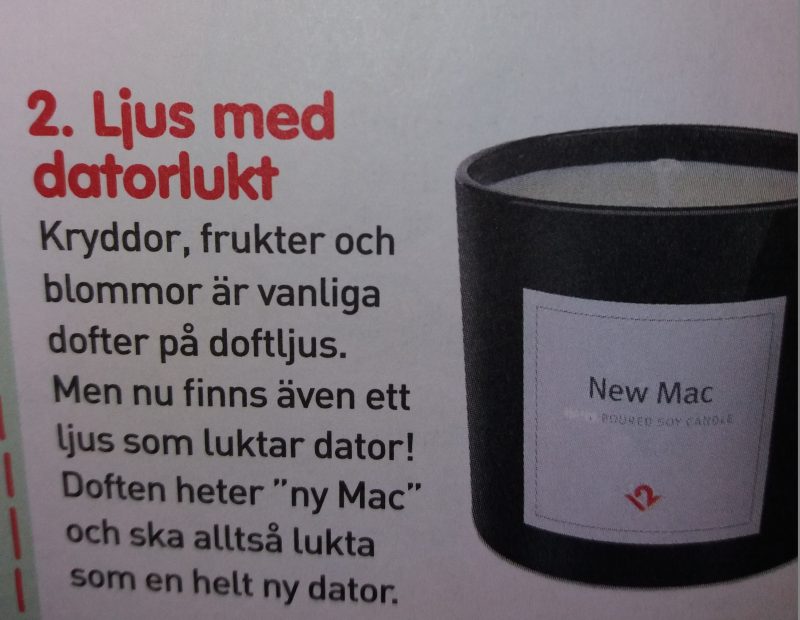Jag slutar nog aldrig förvånas över alla slags doftljus som säljs. Nu till exempel har jag hittat ett ljus som ska dofta som en ny Mac-dator. Inte för att jag vet hur en sån luktar, men det är ju en kul grej. Själv skulle jag vilja ha ett ljus som doftar som en nytryckt bok om man nu skulle få välja. 😉
